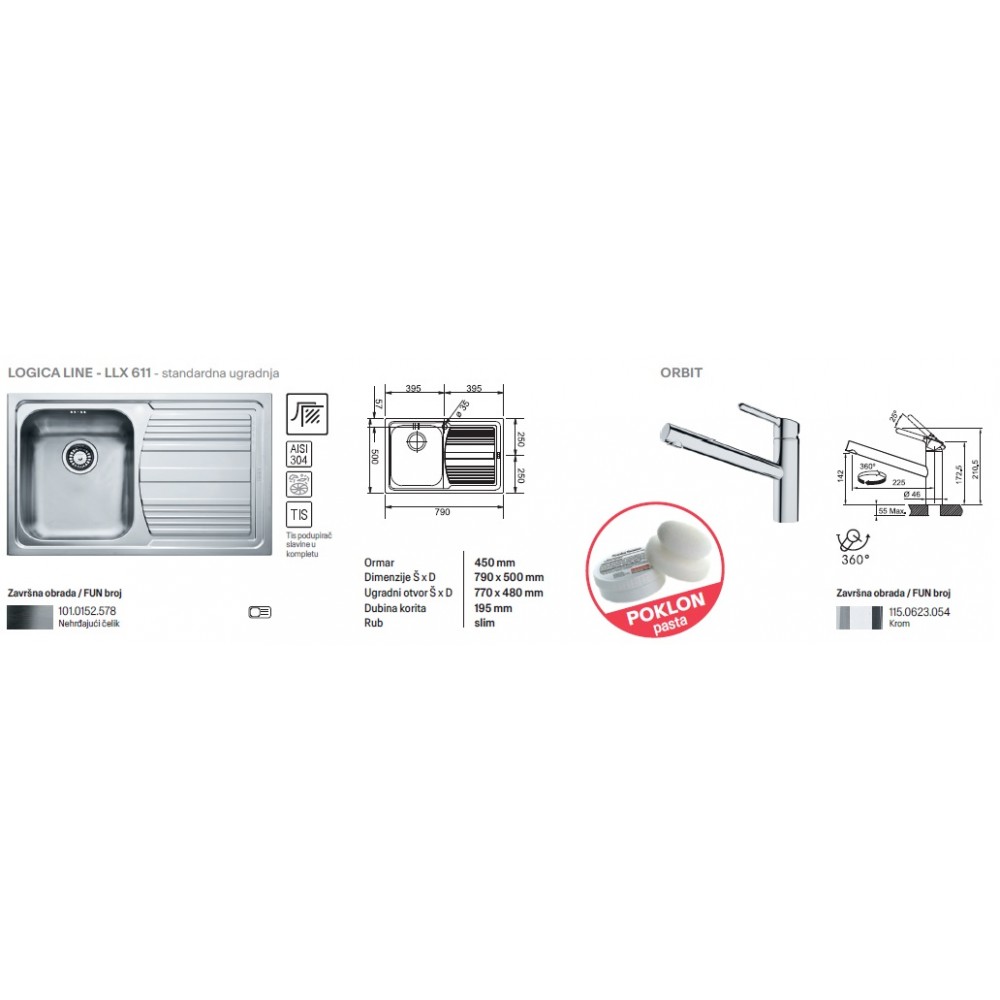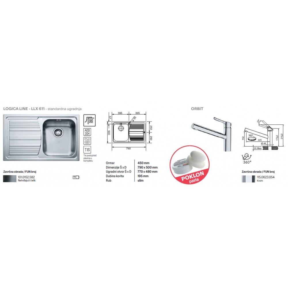Novo Quick view Add to cart Remove from Wishlist Add to Wishlist Add to Compare Franke set sudoper i slavina LOGICA LINE - LLX 611 ocjeđivač desno + ORBIT Cijena 239,00 €