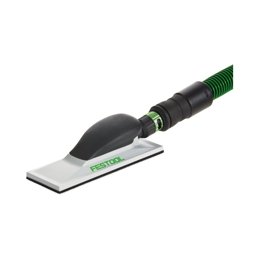 Izvlačni blok za ručno brušenje prikladan je za brušenje kutova ili teško dostupnih mjesta na površinama za punjenje. Snaga usisavanja stoga se može optimalno prilagoditi podešavanjem premosnice. Zahvaljujući zaobljenim kutovima sloja neravnina, ne oštećuju se površine koje se obrađuju. Ergonomska ručka sprječava stvaranje žuljeva na rukama. Može se koristiti s Festool crijevima za usisavanje zahvaljujući integriranom adapteru.