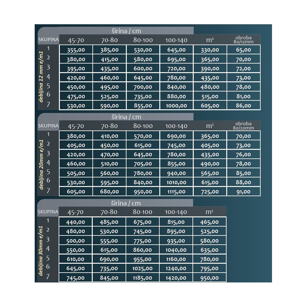 -debljine ploča: 1,2 cm, 2 cm i 3 cm